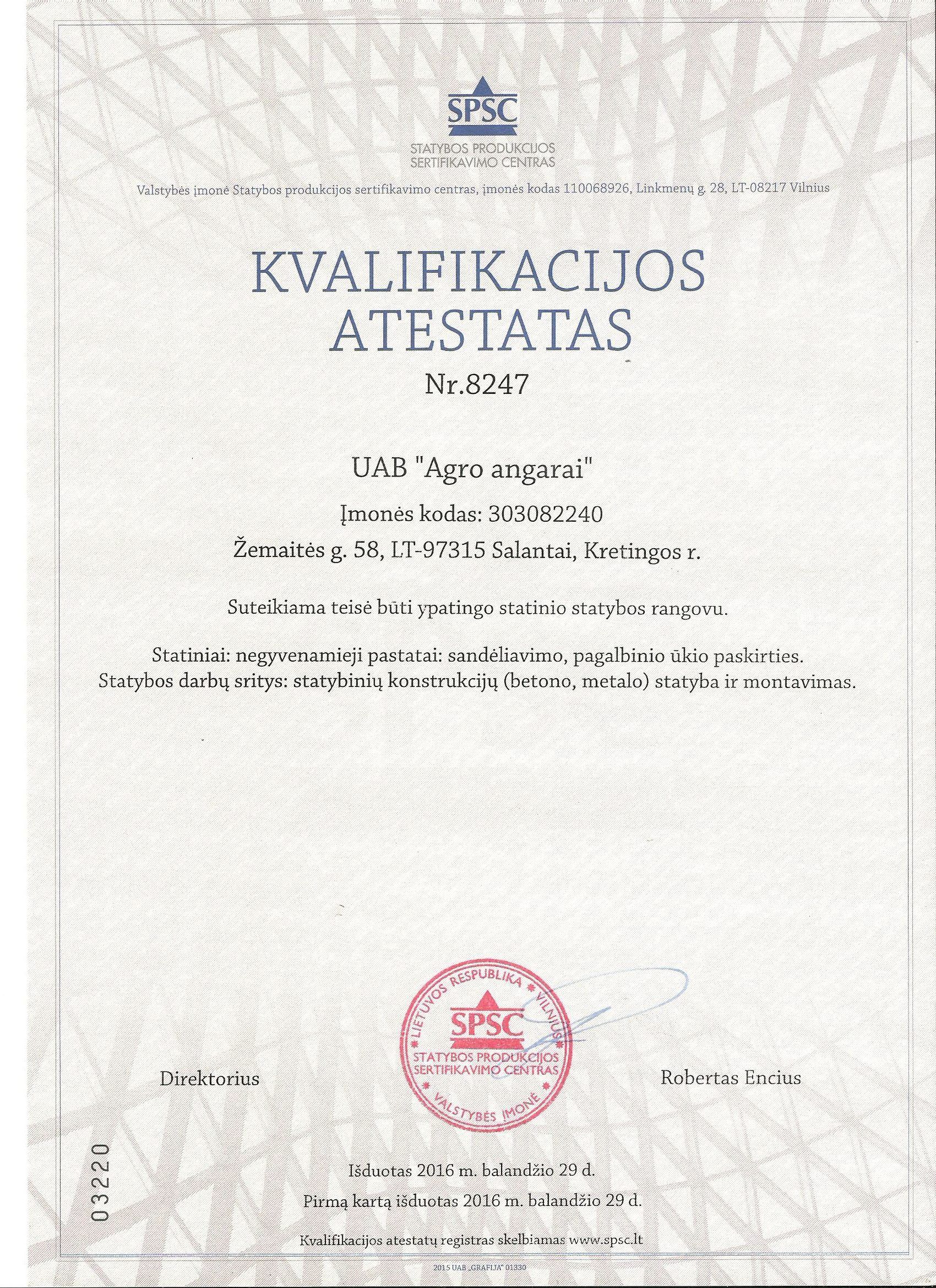 - 2016m., spsc suteiktas atestatas, būti ypatingo statinio statybos rangovu.