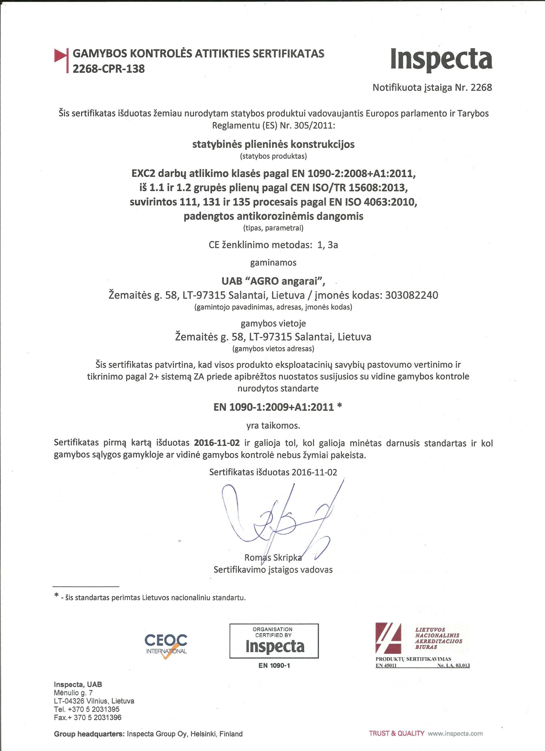 - 2016 m., uab "Agro angarams" Išduotas gamybos kontrolės sistemos sertifikatas.